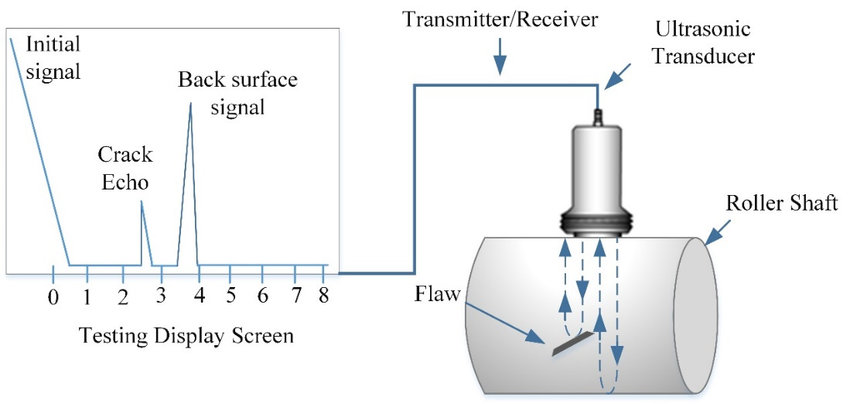 The technique detects internal, hidden discontinuities that may be deep below the surface. Transducers and coupling wedges are available to generate waves of several types, including longitudinal, shear, and surface waves. Applications range from thickness measurements of thin steel plates to internal testing of large turbine rotors.